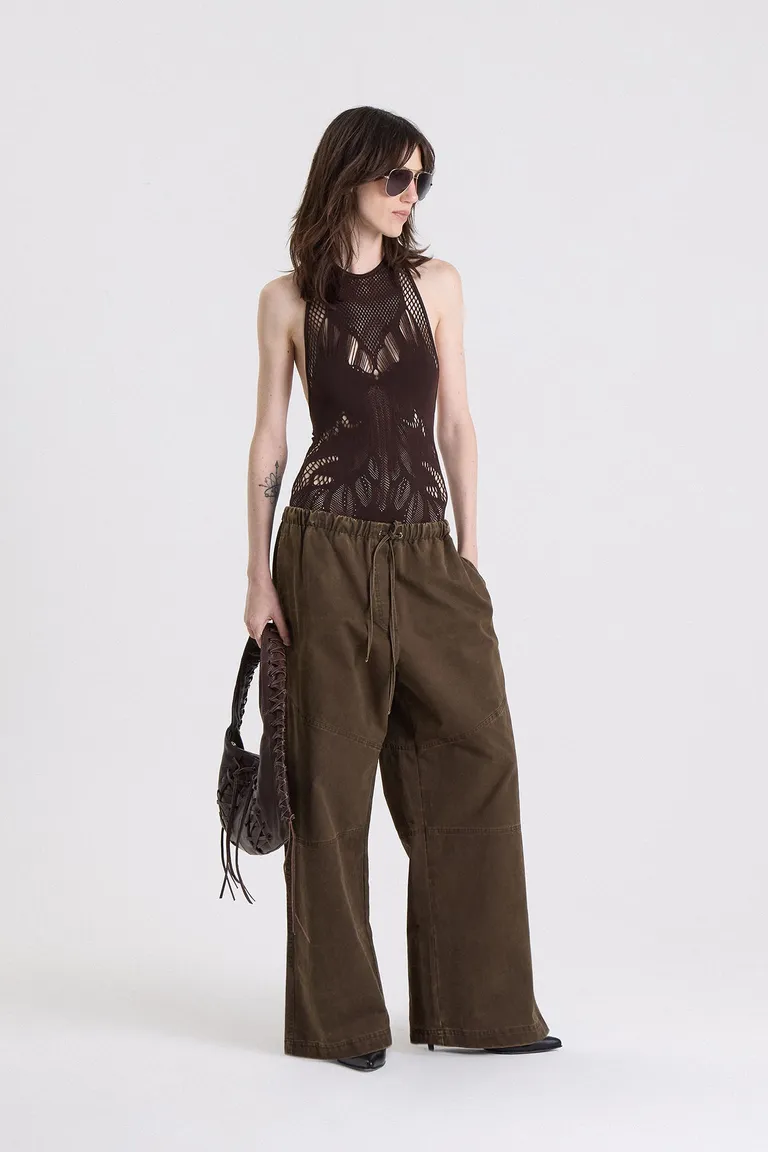 Pantalón de corte amplio con diseño de calce recto y tiro holgado. Cuenta con ajuste en la cintura mediante cordón y detalles de costuras laterales que aportan estructura al diseño, ofreciendo una opción versátil para diversos looks urbanos.