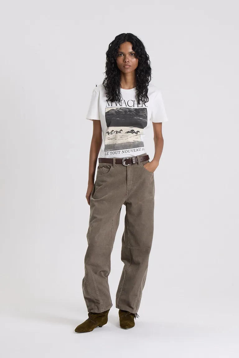Pantalon de tiro medio con corte estilo barrel, caracterizado por su silueta curva en las piernas y detalle de pinzas en la zona de las rodillas. Presenta un diseño de largo cropped, ideal para quienes buscan una prenda versátil y contemporánea para el uso diario. Se complementa con una cintura definida y es apto para combinar con diversos calzados y accesorios, manteniendo una estética urbana y funcional en cualquier temporada.