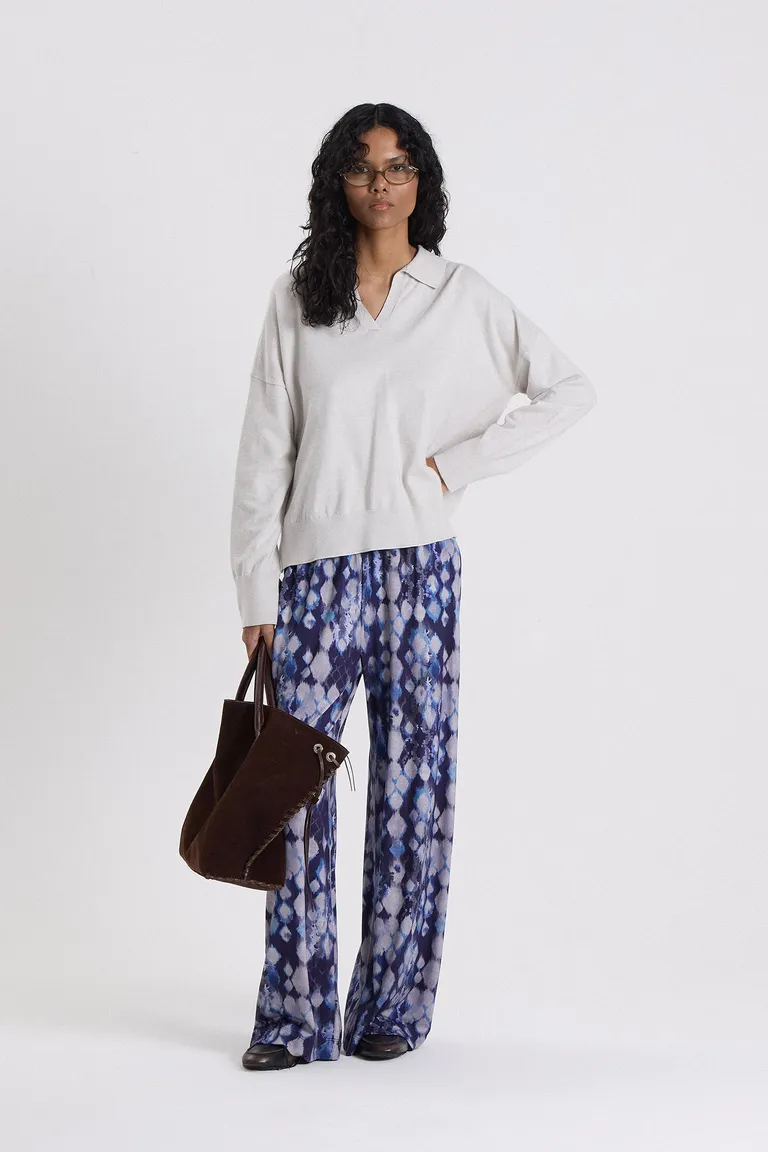 Pantalón de corte amplio con diseño estampado, confeccionado con un estilo fluido y cintura elástica. Presenta una silueta holgada tipo oxford, ideal para lograr un look relajado y versátil. Su diseño permite diversas combinaciones, ofreciendo comodidad y un movimiento natural al caminar.