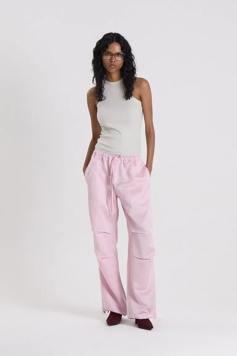 Pantalón de estilo parachute con calce relajado y caída fluida. Cuenta con cintura elástica y ajuste mediante cordón, junto con detalle de jareta en la botamanga y bolsillos laterales funcionales. Una prenda versátil ideal para combinar en looks casuales y urbanos.