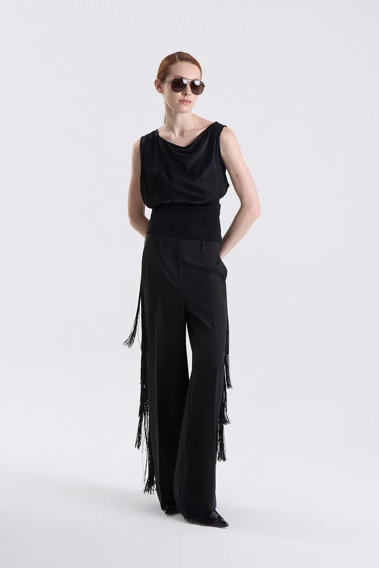 Pantalón de corte sastrero con cintura definida y cierre metálico oculto. Presenta bolsillos funcionales en costuras laterales y ojal en la parte posterior. El diseño se destaca por la incorporación de flecos en los laterales de las piernas, aportando dinamismo y movimiento a la prenda. Una opción elegante y versátil para complementar diversas propuestas de vestuario urbano.