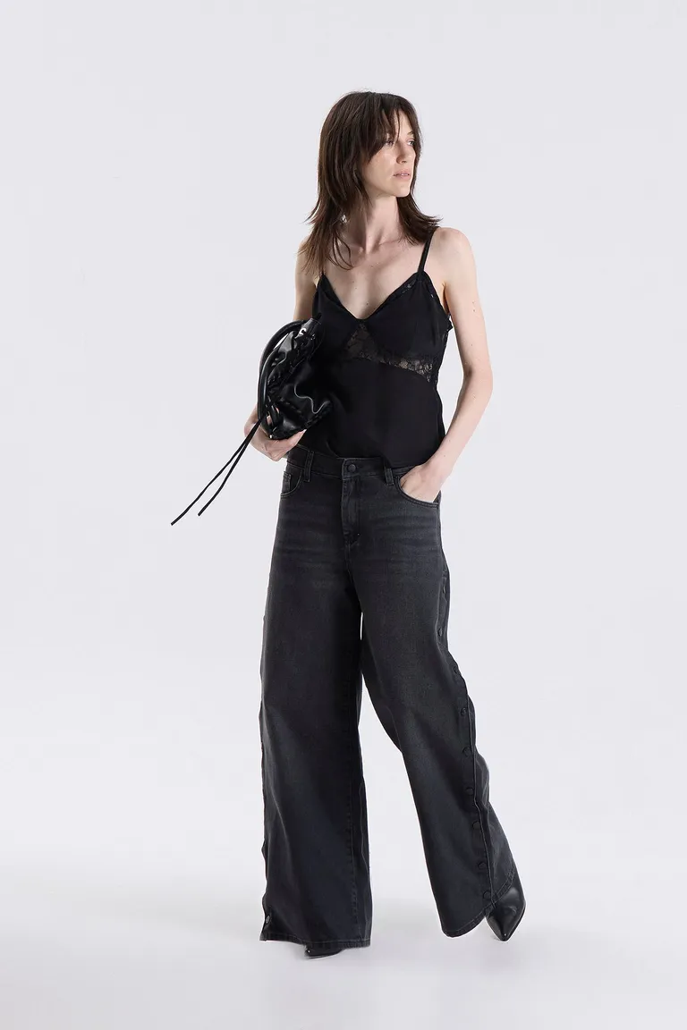 Jean de corte wide leg con silueta amplia y relajada. Presenta un diseño distintivo con una serie de broches metálicos a lo largo de los laterales externos de las piernas, permitiendo regular el calce y la apertura según la preferencia. Una prenda versátil y cómoda ideal para integrar en conjuntos casuales de uso diario.