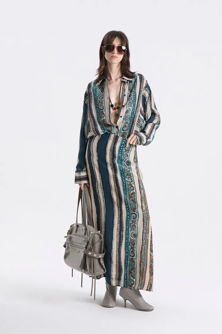 Pollera larga con diseño estampado, corte recto y cierre invisible lateral. Esta prenda de línea clásica ofrece un calce cómodo y versátil para diversos looks diarios.