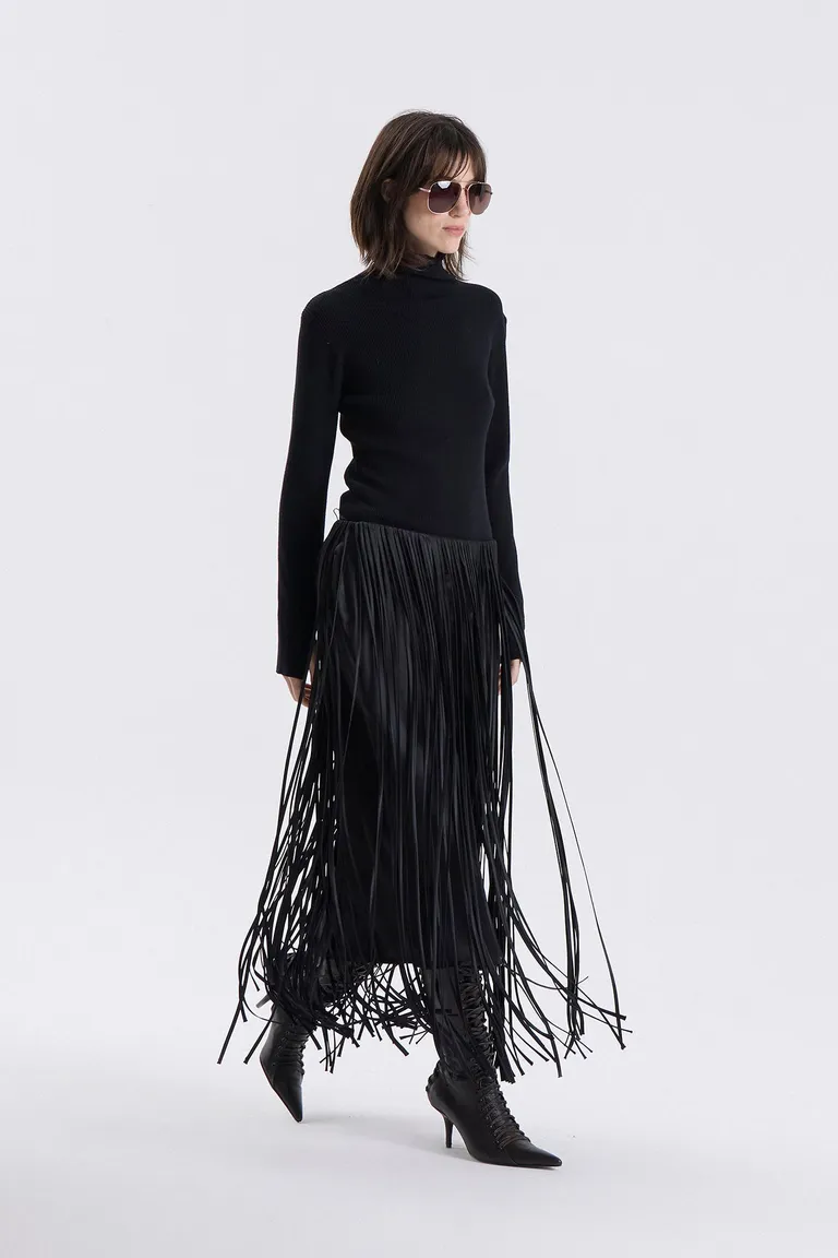 Pollera de largo midi con cierre lateral invisible y diseño de flecos que se extienden desde la cintura hasta el ruedo. Una prenda versátil que aporta movimiento y estilo a cualquier conjunto, ideal para combinar en diversas ocasiones.