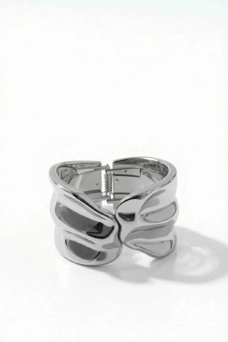 Elegante pulsera de diseño orgánico con acabado brillante. Su estructura liviana y delicada presenta alas con bordes finos que aportan sofisticación al look. El sistema de apertura automática facilita su colocación. Una pieza versátil ideal para complementar outfits tanto casuales como formales.