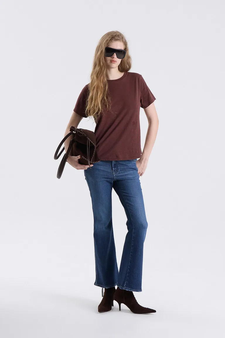 Remera de manga corta con escote redondo, diseñada con un calce cómodo ideal para el día a día. Presenta un detalle bordado distintivo en la parte frontal que aporta un acabado sutil a la prenda básica de temporada.