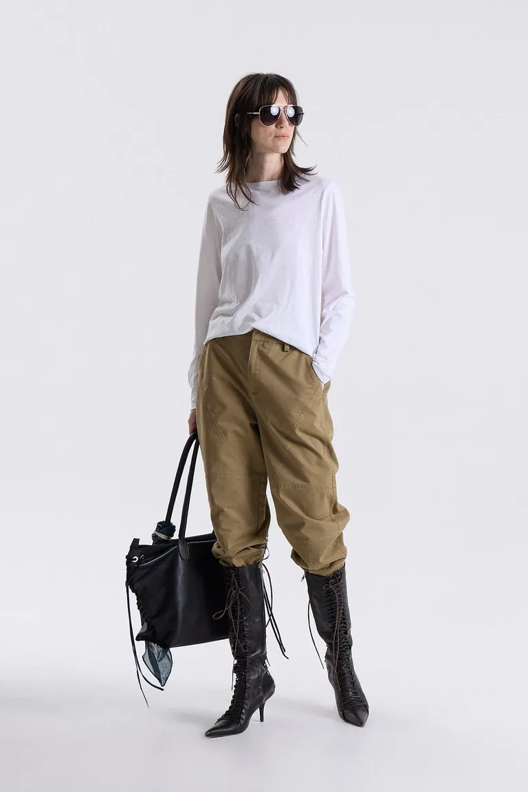 Remera de manga larga con diseño de escote redondo y corte relajado. Presenta un detalle bordado en el frente que aporta una textura sutil a la prenda, ideal para completar outfits casuales con un estilo versátil y contemporáneo.