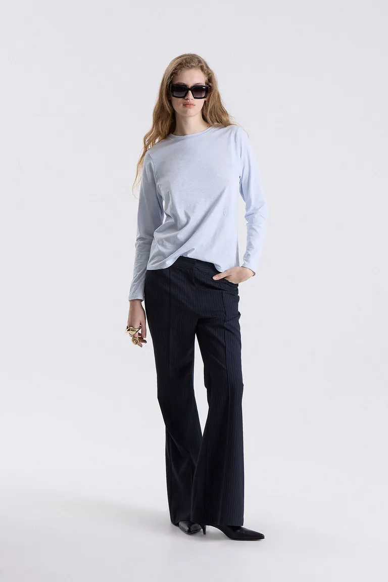 Remera de manga larga con escote redondo y calce holgado. Presenta un diseño minimalista con detalle de bordado en el frente, ideal para combinar en looks casuales y urbanos. Una prenda versátil para el uso diario en cualquier temporada.