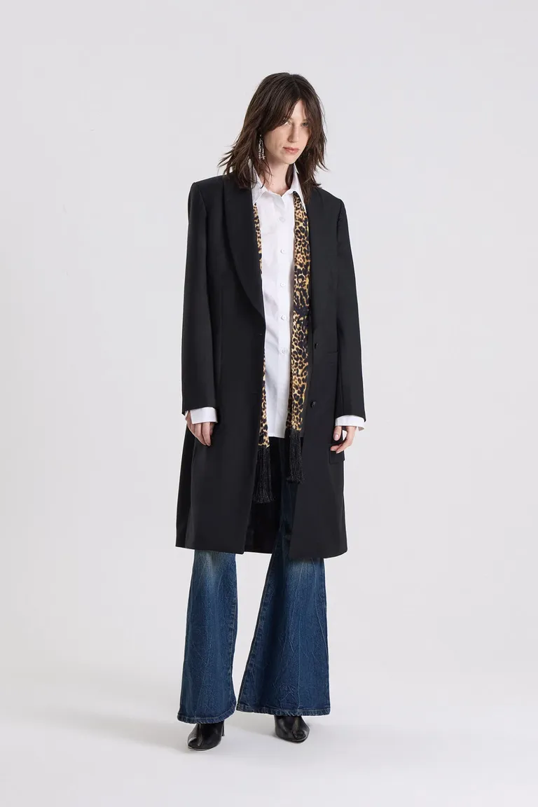 Saco largo entallado de líneas rectas con solapas amplias y diseño clásico minimalista de Maria Cher