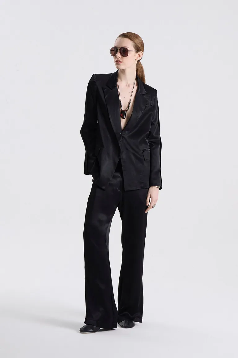 Saco sastrero con diseño de solapas amplias, bolsillos laterales con tapa y detalle de tajos en mangas. Confeccionado con un acabado satinado que aporta un estilo distinguido y fluido a cualquier conjunto. Su corte entallado con pinzas en la espalda logra una silueta definida y sofisticada para lucir en eventos sociales o reuniones formales durante todo el año.