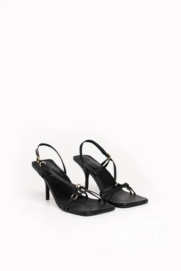 Sandalias de taco con diseño de tiras finas cruzadas y detalles de argollas metálicas. Un calzado refinado con puntera cuadrada y taco alto que aporta estructura y elegancia a diversos conjuntos para ocasiones especiales o eventos nocturnos.