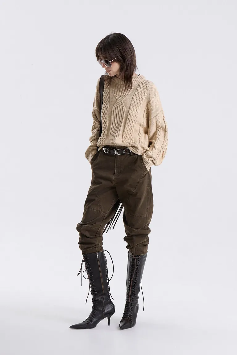 Sweater tejido con cuello redondo y diseño de texturas en el frente. Presenta un calce cómodo y holgado, ideal para completar equipos informales o urbanos con estilo y abrigo durante toda la temporada.