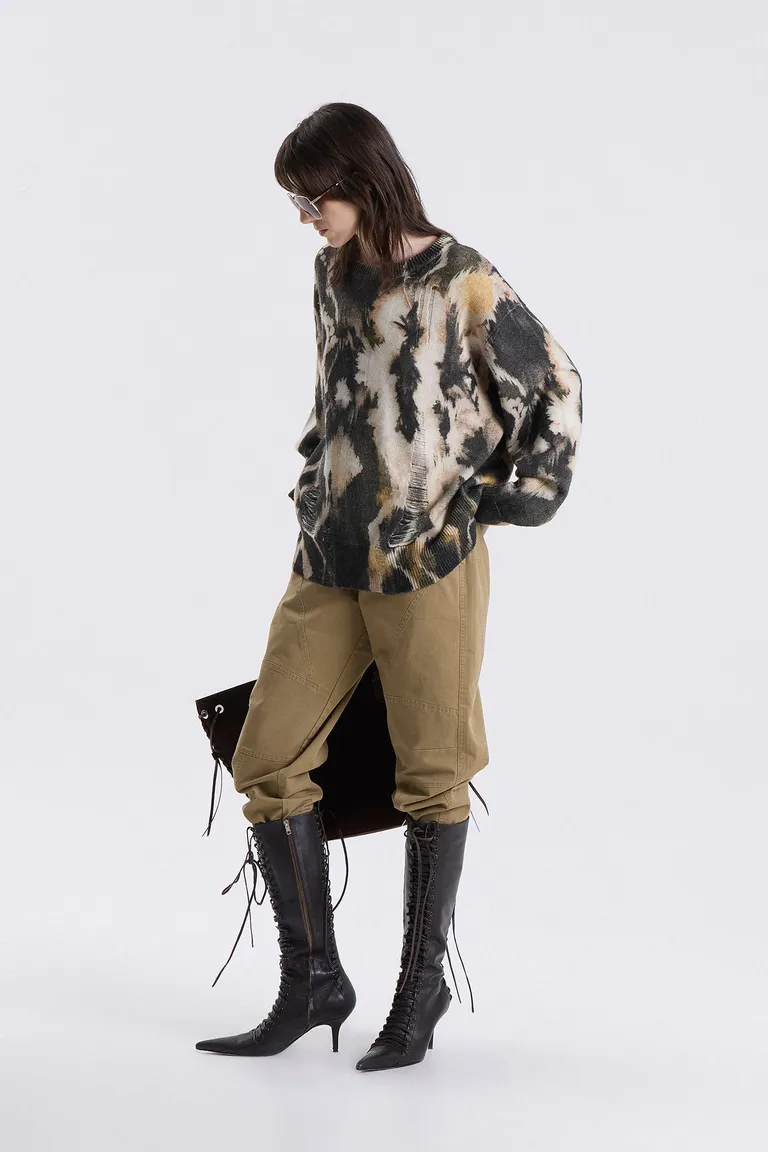 Sweater tejido de calce holgado con estampa integral y cuello redondo de ajuste relajado de Maria Cher
