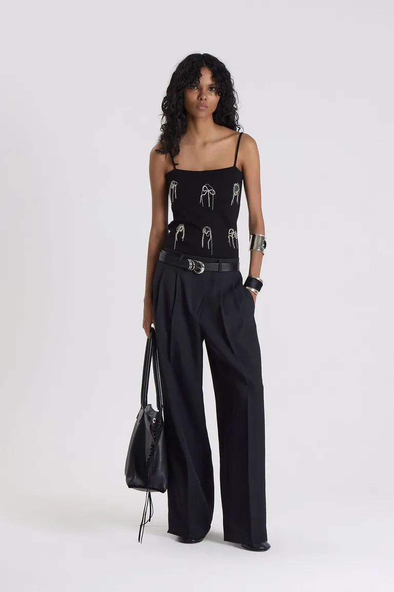 Top de corte ajustado con breteles finos y diseño de escote cuadrado. Presenta un detalle decorativo aplicado en la parte frontal que aporta textura y un estilo distintivo. Un modelo versátil ideal para combinar en diversas ocasiones, ofreciendo un ajuste cómodo al cuerpo.