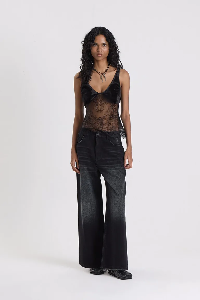 Top sin mangas con escote en V profundo, confeccionado con una combinación de detalles de encaje y texturas suaves. Su diseño entallado aporta una silueta definida, ideal para combinar en diferentes ocasiones con un cierre invisible lateral que facilita su ajuste.