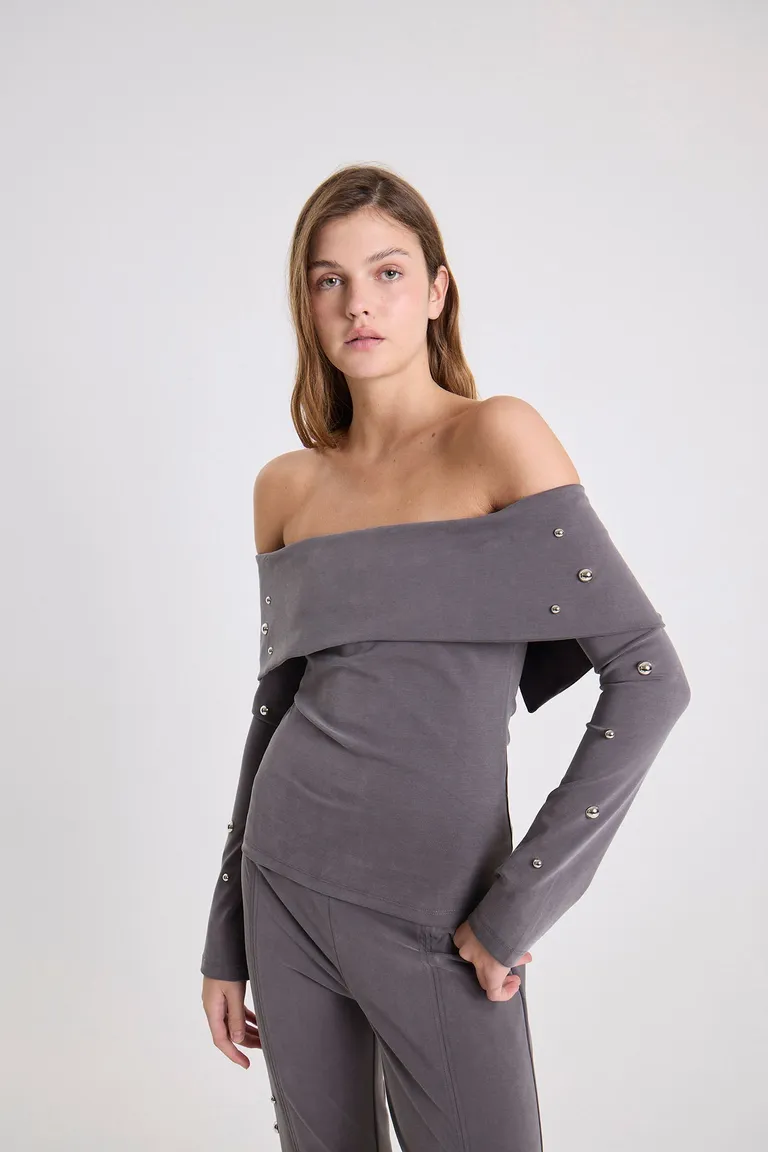 Top de manga larga con diseño de hombros descubiertos. Presenta un escote tipo bandeau que envuelve el pecho y detalles de remaches metálicos distribuidos a lo largo de las mangas y el frente. Una prenda versátil y ajustada que realza la silueta, ideal para completar diversos conjuntos con un toque distintivo y moderno.