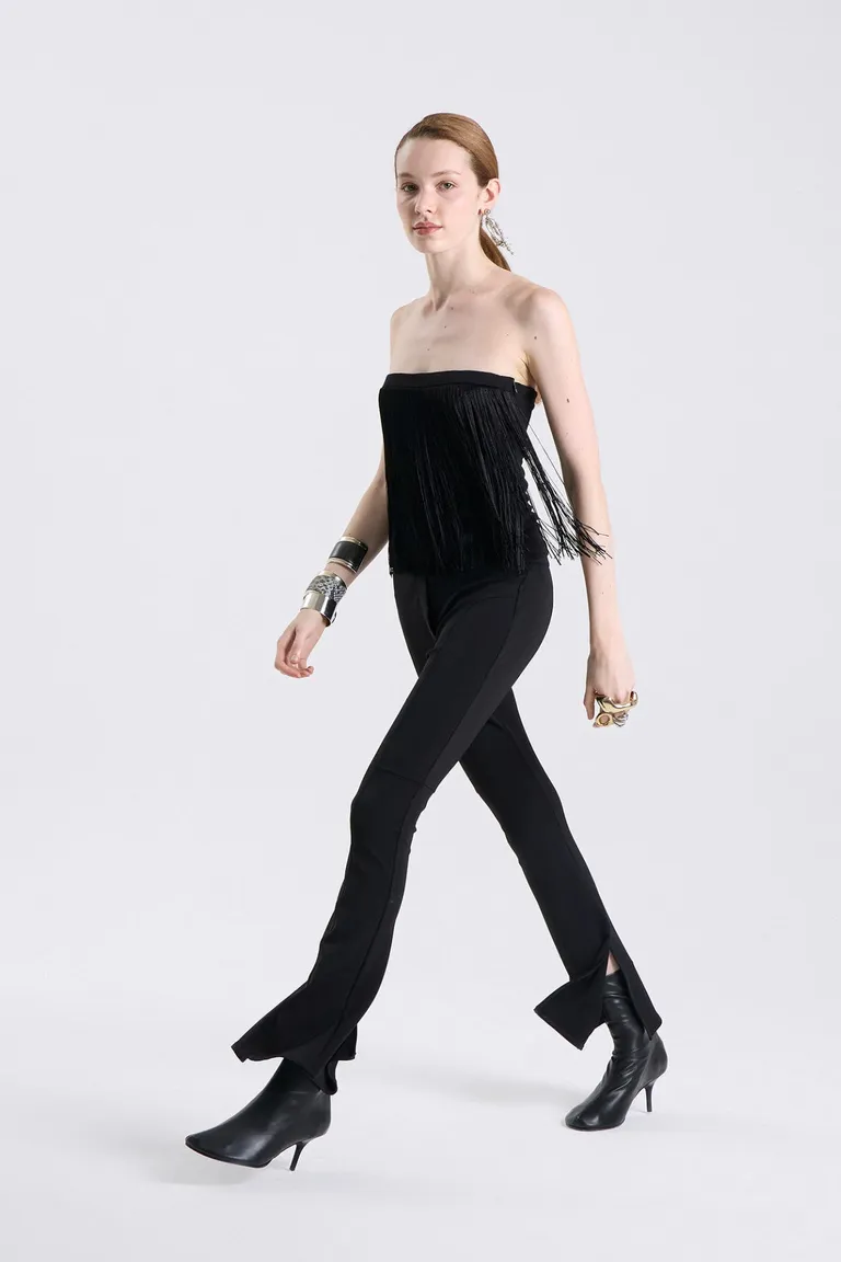 Top strapless con flecos frontales y cierre lateral. Diseño ajustado que aporta movimiento y elegancia, ideal para eventos nocturnos o salidas especiales donde se busca un estilo sofisticado y distintivo.