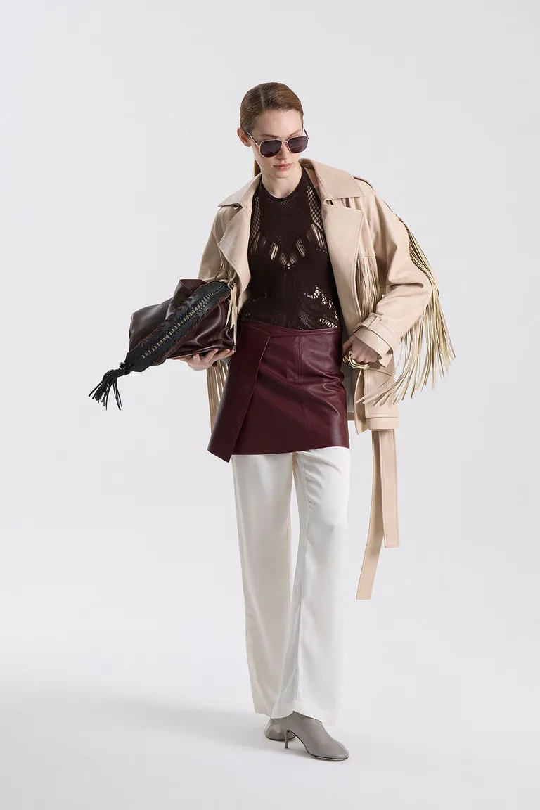 Trench corto con diseño de flecos en mangas y espalda, incorporando elementos clásicos como charreteras y cruce de botones. Una prenda versátil con aires contemporáneos ideal para completar outfits urbanos.