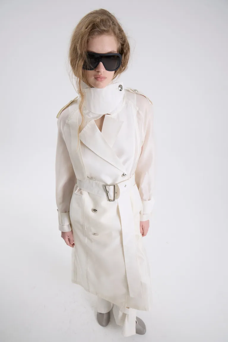 Trench largo de diseño elegante con silueta recta, cierre mediante botones y cinturón ajustable que define la cintura. Una prenda de abrigo versátil y sofisticada para completar outfits de media estación con estilo y distinción.