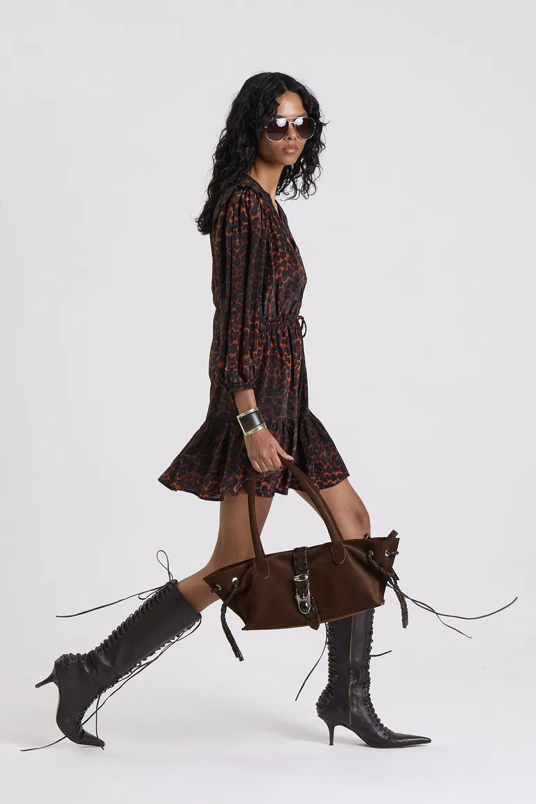 Vestido corto con escote en V y mangas largas con puños elásticos. Diseño con cintura ajustable para definir la silueta, falda con vuelo y detalle de volado en el ruedo. Una prenda versátil y cómoda con diseño estampado, ideal para elevar cualquier outfit casual o formal en toda ocasión.