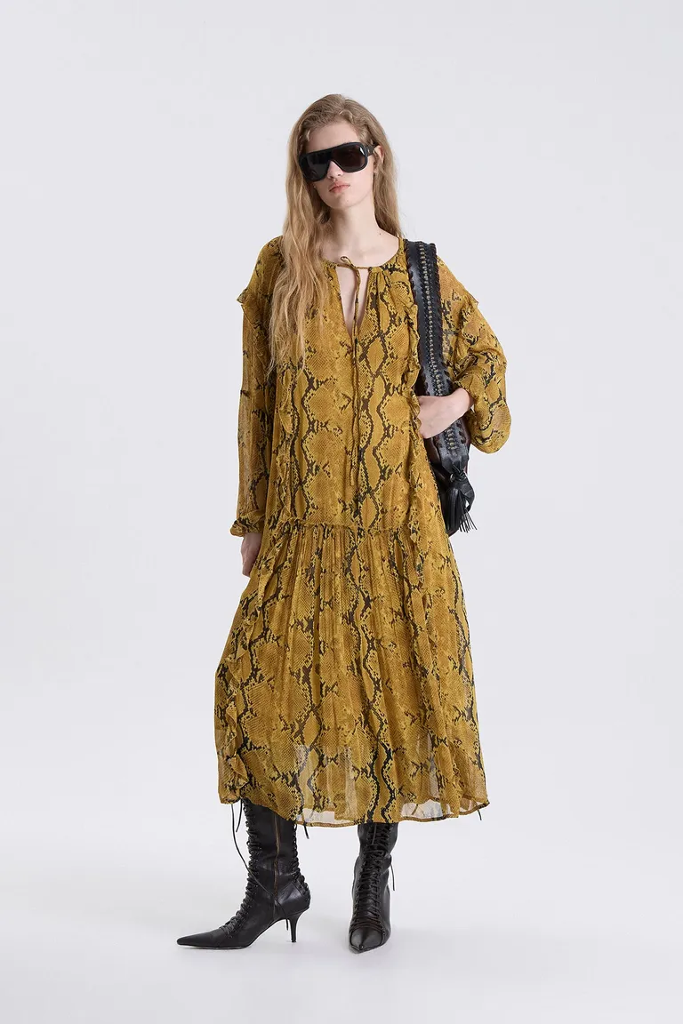 Vestido midi de diseño holgado con estampa animal, mangas amplias con ajuste en puños y detalle de lazo. Incorpora volados que aportan movimiento y una silueta relajada, ideal para integrar en conjuntos versátiles para el día a día o eventos informales.