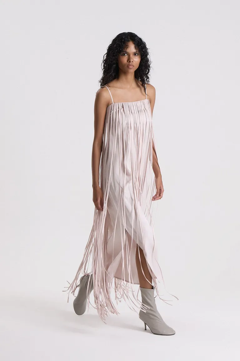 Vestido midi de corte fluido con escote recto y breteles finos ajustables. Presenta un diseño destacado por flecos largos que recorren toda la prenda, brindando un movimiento distintivo en cada paso. Ideal para eventos o salidas donde se busca una silueta sofisticada y con personalidad. Su largo a media pierna lo convierte en una pieza versátil para diversas ocasiones de uso.