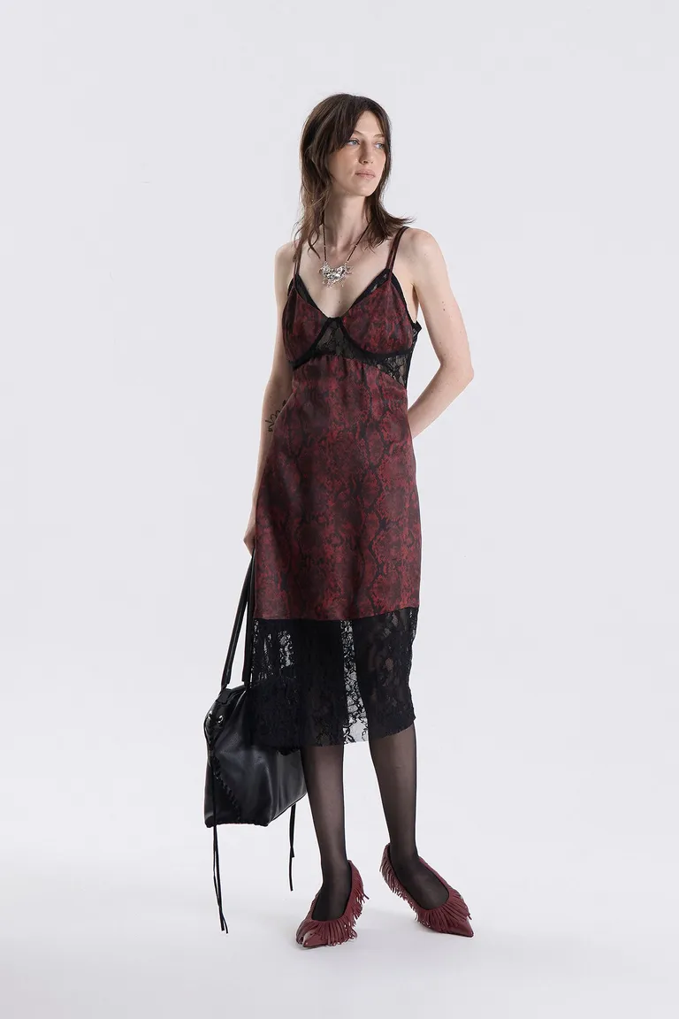 Vestido midi de estilo lencero con diseño de estampado animal y detalles de encaje en el ruedo. Presenta escote en V, breteles regulables y una caída fluida que se ajusta al cuerpo. Es una prenda versátil y ligera, diseñada para adaptarse a diferentes ocasiones, permitiendo múltiples combinaciones con otras prendas o accesorios para lograr un estilo moderno y actual.