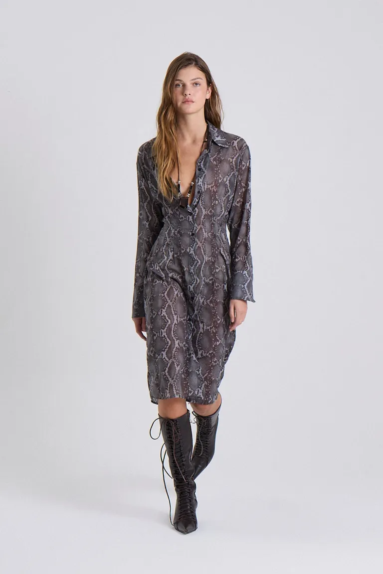 Vestido midi de corte camisero con diseño entallado que destaca la silueta gracias a sus pinzas en la cintura. Presenta un patrón de reptil que aporta un estilo distintivo. Es una prenda versátil, ideal para quienes buscan una opción elegante y actual para diversas ocasiones durante el día o la noche.