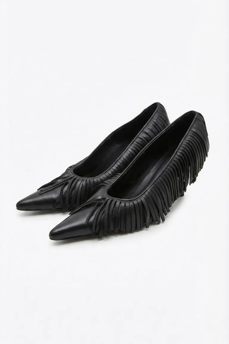 Zapatos de diseño con terminación en punta y detalle de flecos decorativos que rodean la silueta. Ideales para completar un look distinguido, ofrecen un calce cómodo y versátil para diversas ocasiones. Un modelo clásico con un toque moderno y sofisticado para renovar tu colección de calzado.