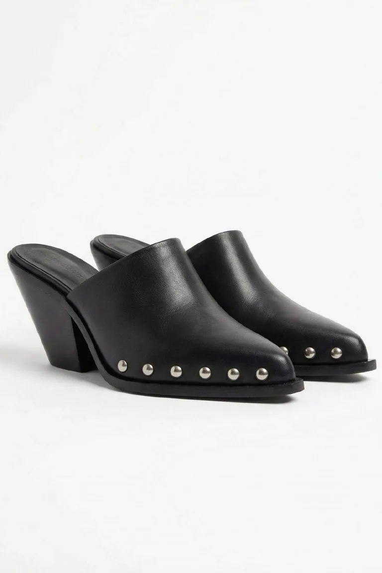 Zuecos con puntera cerrada y taco geométrico de altura media. El diseño presenta una detalle de tachas metálicas a lo largo del contorno inferior, brindando un estilo distintivo. Ideal para complementar diversos conjuntos con un toque moderno y elegante.