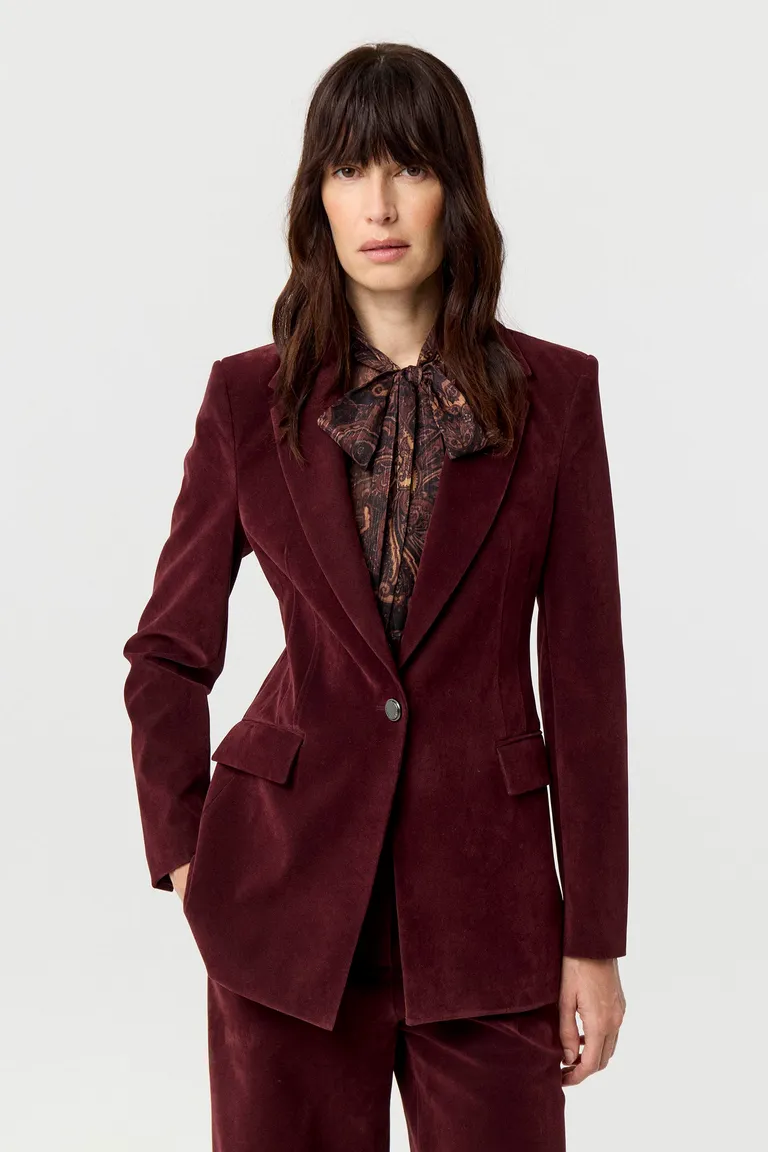 Blazer de silueta entallada con diseño de mangas largas y cierre frontal con botón. Esta prenda de corte clásico presenta bolsillos laterales con solapa y un ajuste estructurado que favorece la figura, ideal para completar equipos de estilo formal o urbano en el guardarropa femenino.