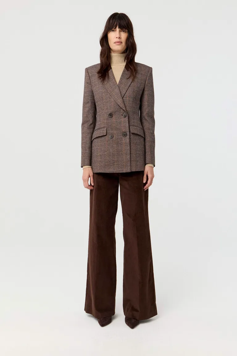 Blazer de corte sastrero con diseño cruzado, solapas clásicas y botones frontales. Una prenda versátil de líneas estructuradas ideal para complementar conjuntos formales o elevar un outfit urbano. Presenta una silueta entallada que aporta un estilo sofisticado y atemporal para diversas ocasiones.