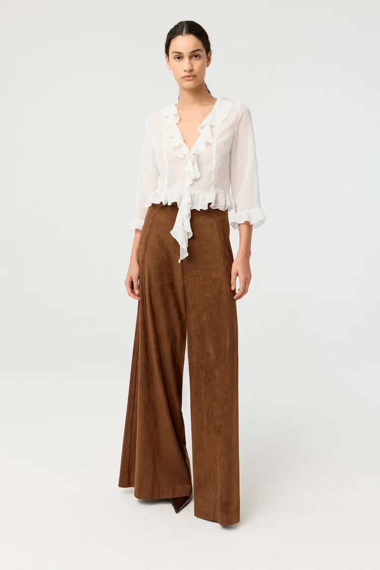 Blusa de textura delicada con diseño de calce al cuerpo. Presenta un escote en V con volados decorativos, mangas largas con puños fruncidos y detalle de botones frontales. Una prenda versátil con aires románticos, ideal para sumar elegancia a tus equipos diarios.