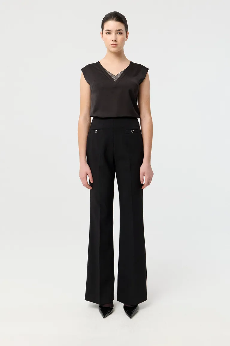 Blusa de corte entallado con mangas cortas, hombros caídos y escote en V con detalle de strass. Una prenda versátil diseñada para complementar tanto outfits formales como nocturnos, ofreciendo un calce estilizado para diversas ocasiones.