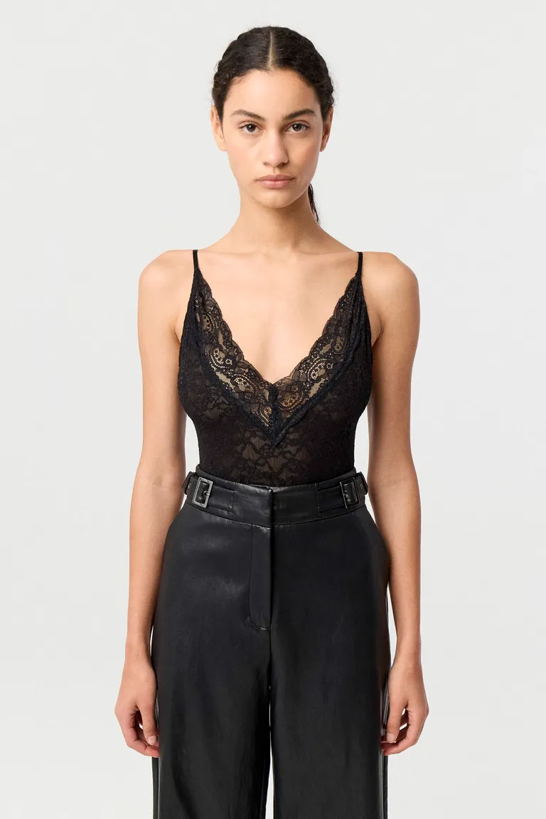 Body de encaje con diseño anatómico y escote en V con detalle de puntilla. Cuenta con breteles finos regulables y cierre inferior con broches. Una prenda elegante y versátil para complementar looks de noche o eventos especiales con un toque de sofisticación.
