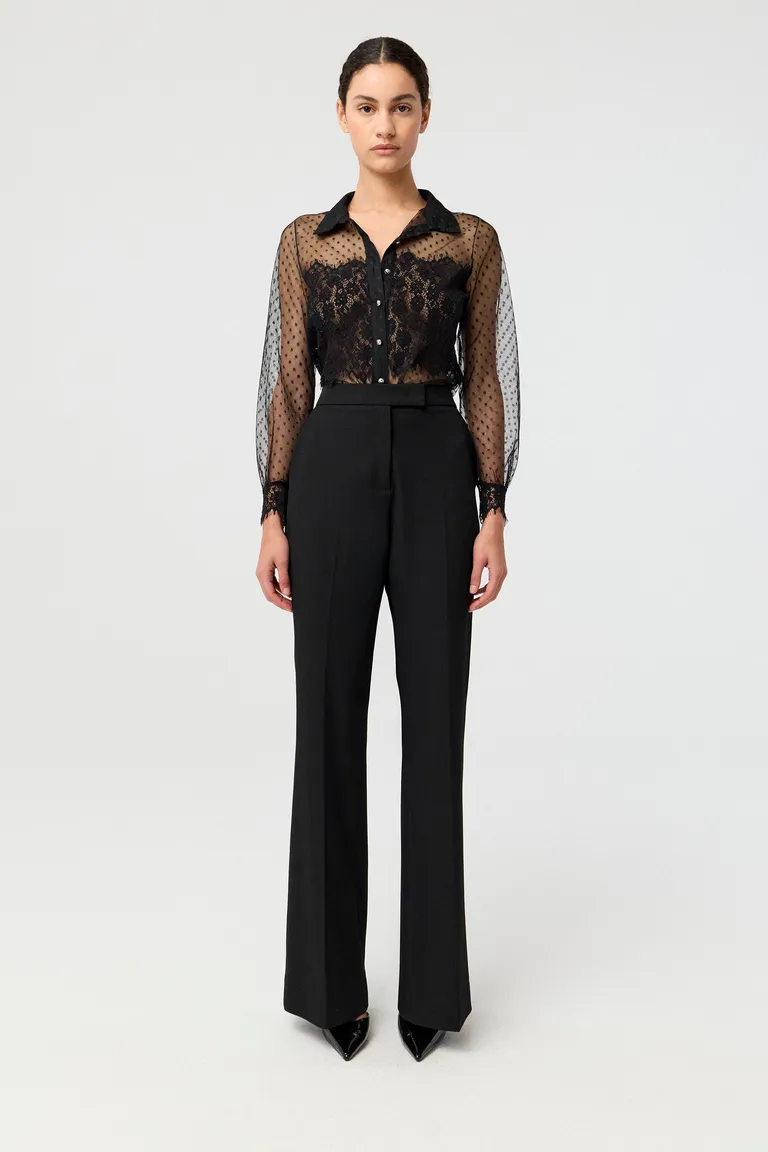 Camisa de manga larga con diseño de plumetí y detalles de encaje. Presenta cuello clásico, cierre frontal con botones y terminaciones en puños. Una prenda versátil y distinguida para sumar elegancia a diversos equipos, combinable tanto con pantalones de vestir como con otras opciones para eventos nocturnos o sociales.