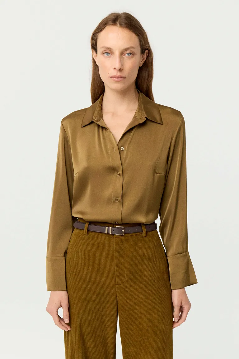 Camisa de satén con cuello clásico y botones frontales. Presenta mangas largas con puños destacados, ofreciendo un ajuste favorecedor al cuerpo. Ideal para combinar en diversos outfits, brindando un aspecto pulido y versátil para el uso diario o eventos formales. Un diseño atemporal para completar el guardarropa femenino.