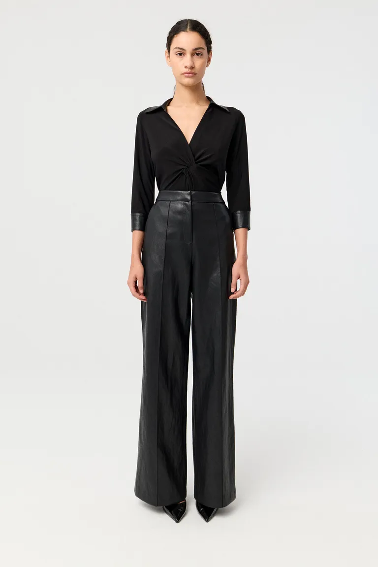 Camisa de calce anatómico con escote en V, mangas tres cuartos y detalle de nudo delantero. Presenta detalles de terminación en cuello y puños que aportan un estilo moderno y versátil. Es una prenda ideal para elevar outfits formales o de oficina con un toque distintivo.