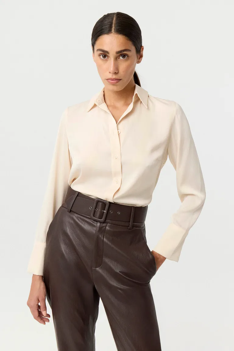 Camisa de corte clásico con cuello camisero y mangas largas terminadas en puños anchos. Presenta un diseño de calce entallado que aporta versatilidad a conjuntos formales o informales. Es una prenda esencial de líneas depuradas, ideal para completar diversos estilos con elegancia y practicidad. De fácil combinación, se integra perfectamente a cualquier guardarropas cotidiano.