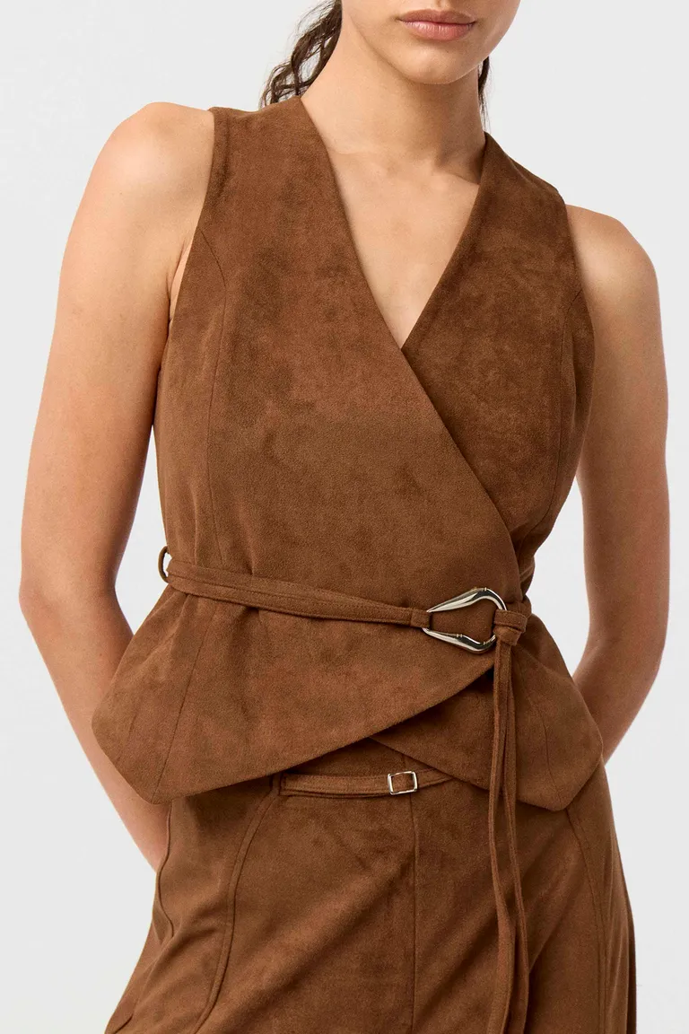Chaleco corto cruzado con escote en V y ajuste en la cintura mediante una tira integrada con hebilla metálica. Presenta un diseño entallado que permite múltiples combinaciones, ideal para integrar en conjuntos formales o informales. Su corte favorecedor lo convierte en una prenda versátil para el uso diario o eventos especiales.