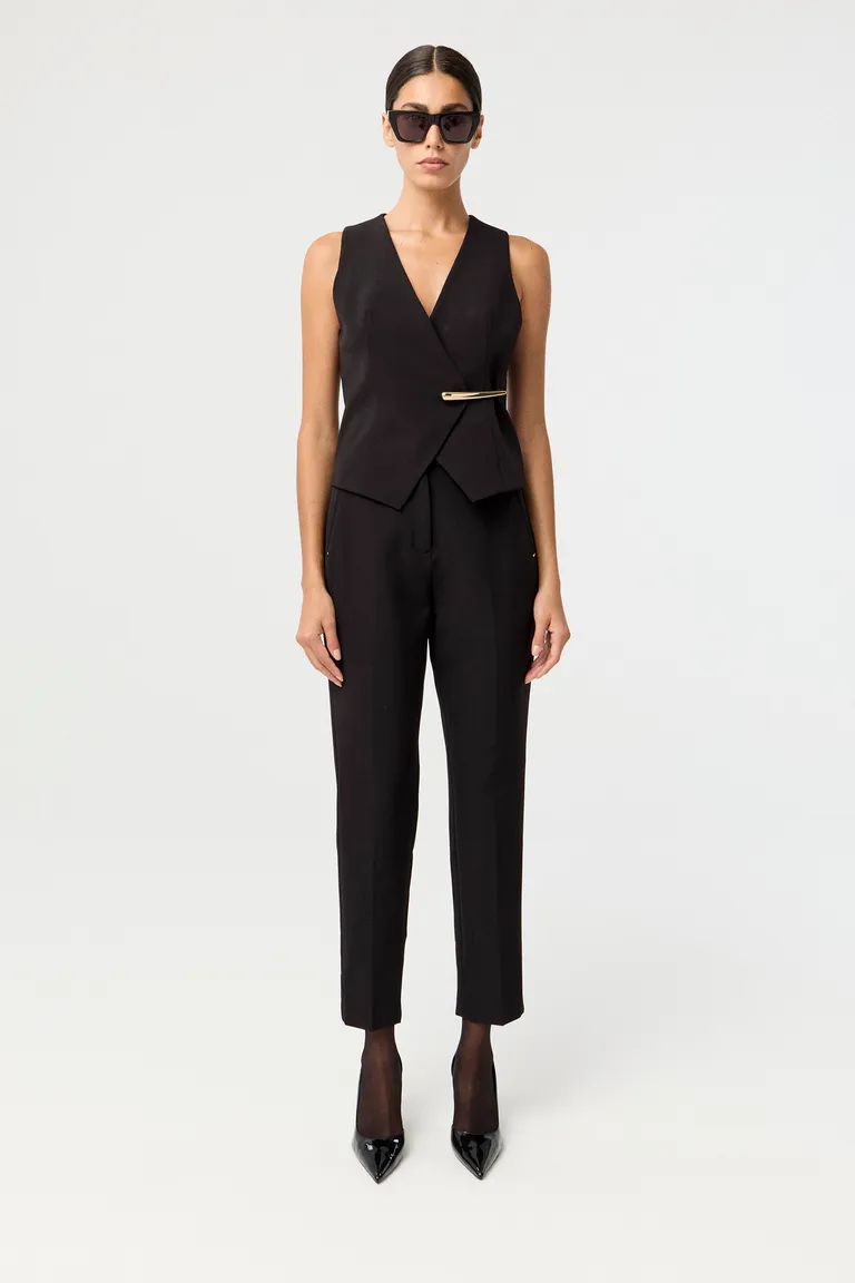 Chaleco de sastrería entallado con escote en v y detalle de avío metálico frontal. Una prenda versátil ideal para combinar en conjuntos formales o elevar un look urbano de oficina con un toque moderno y sofisticado.
