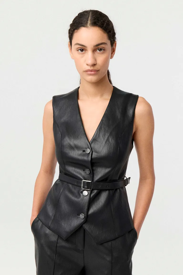 Chaleco sastrero con escote en V y cierre frontal por botones. Incorpora un cinturón fino con hebilla que permite entallar la silueta, ofreciendo un diseño estructurado y versátil. Es una prenda ideal para lograr un look sofisticado y moderno en diversas ocasiones.