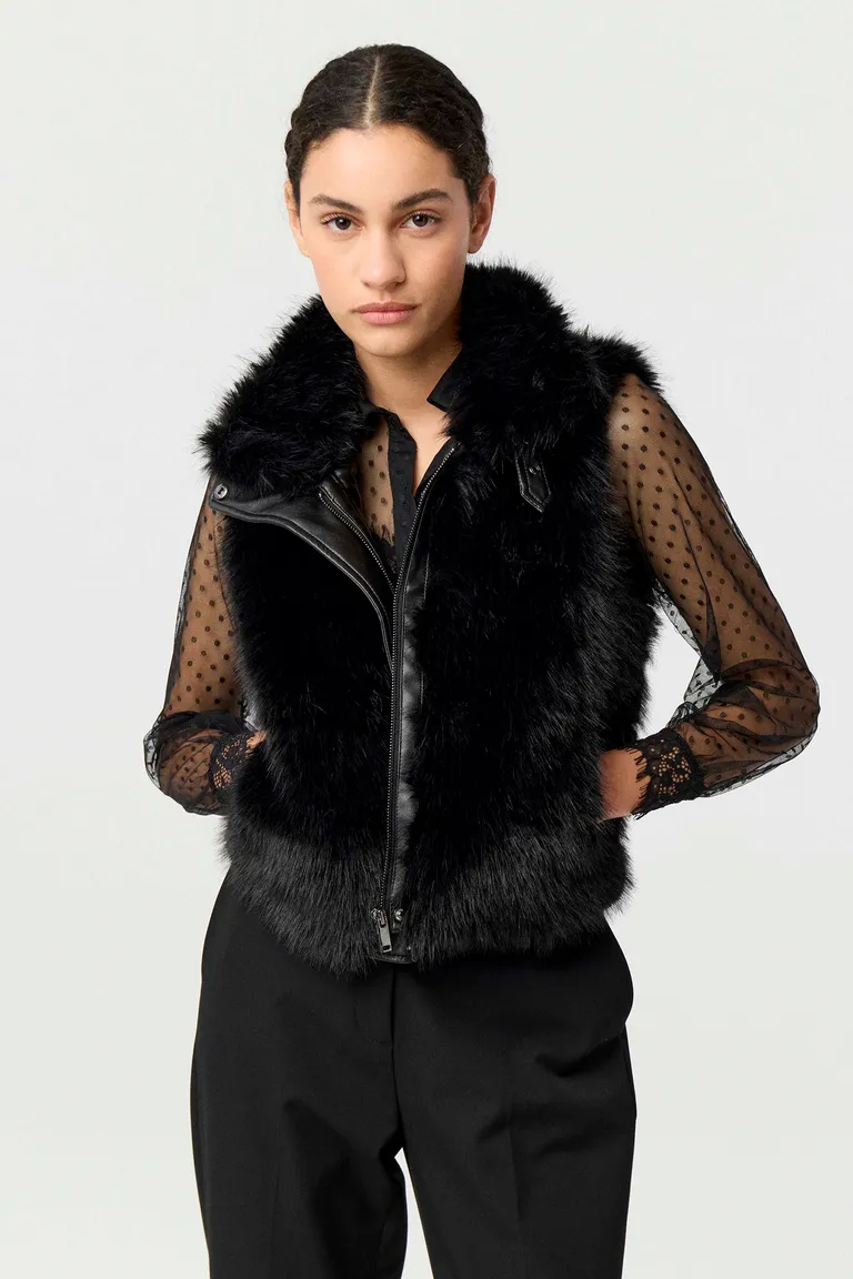 Chaleco de estilo urbano con diseño sin mangas y cierre central. Presenta una textura de pelo con detalles en efecto cuero y hebilla metálica, ideal para complementar outfits de media estación o invierno. Su diseño versátil y estructurado permite diversas combinaciones para un look sofisticado.