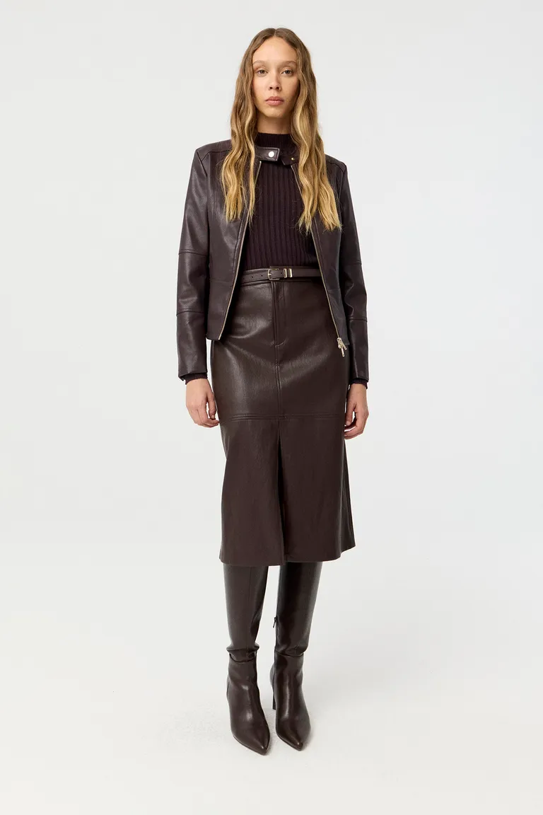 Chaqueta de diseño entallado con cierre central, cuello con broche metálico y bolsillos laterales. Esta prenda de estilo clásico ofrece una estructura moderna, siendo una opción versátil para completar diversos conjuntos tanto en jornadas diurnas como en eventos nocturnos.