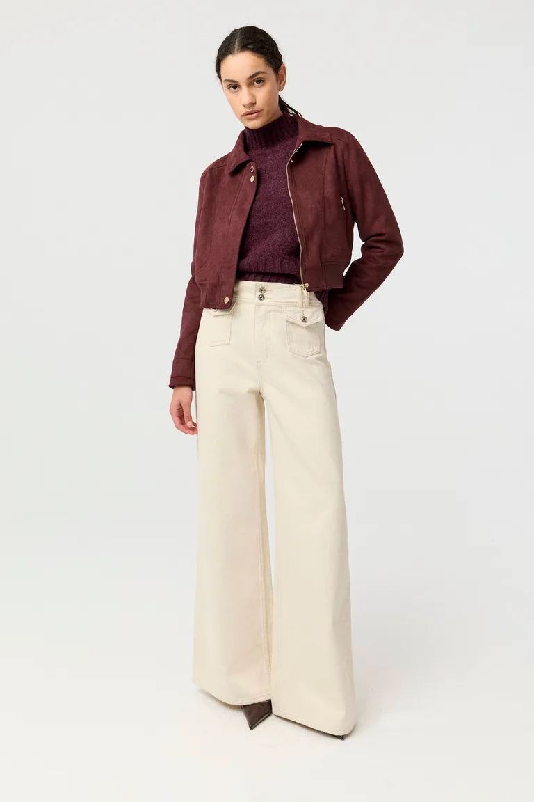 Chaqueta de diseño relajado con cierre central y detalles de broches metálicos. Presenta un acabado texturizado con cintura ajustada por puño tejido, ideal para complementar diversos looks urbanos. Una prenda versátil y moderna que aporta estructura a cualquier conjunto diario.