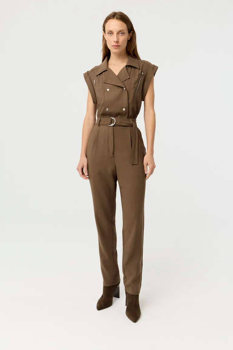 Mono de silueta relajada con diseño de pierna slim y estilo cargo. Presenta cuello con solapa, cierre mediante broches a presión, detalles de cierres decorativos en el pecho y cinturón con hebilla para definir la cintura. Una prenda versátil y contemporánea, ideal para armar equipos urbanos y sofisticados con un calce cómodo y moderno para diversas ocasiones.