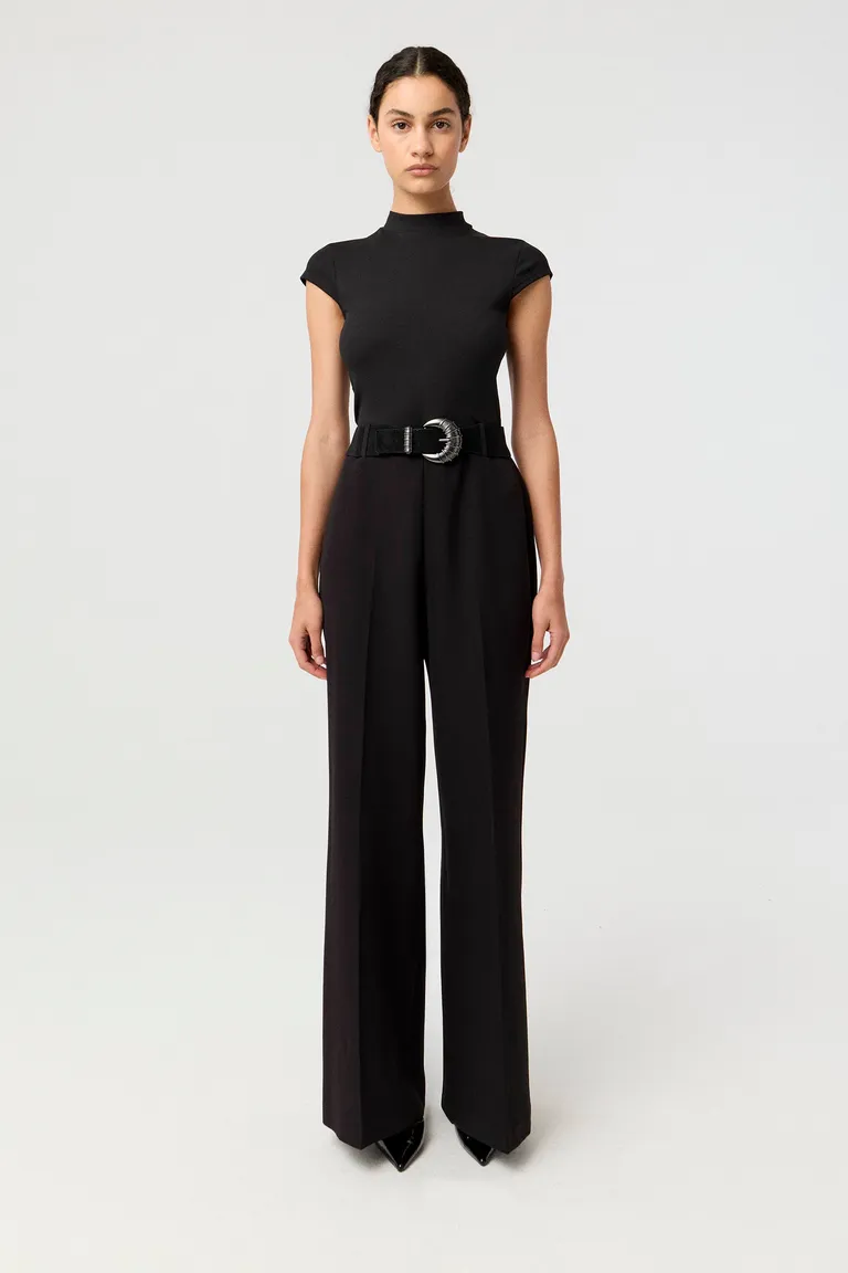 Mono de diseño sofisticado con cuerpo de cuello semi polera y mangas japonesas. Presenta una cintura definida con cinturón, combinada con un pantalón de silueta palazzo amplia y elegante. Ideal para lograr un look formal y distinguido, aportando comodidad y estilo en una sola pieza. Un básico versátil para incorporar al guardarropas diario.