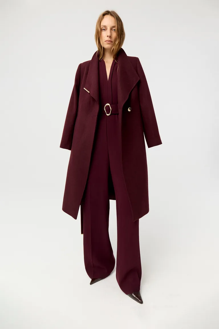 Mono de silueta entallada y pierna ancha fluida. Presenta un escote en v con doble tabla y un cinturón integrado con hebilla metálica para definir la cintura. Su diseño sofisticado incluye acceso mediante cierre invisible en la espalda, siendo una opción versátil y elegante para diversas ocasiones.