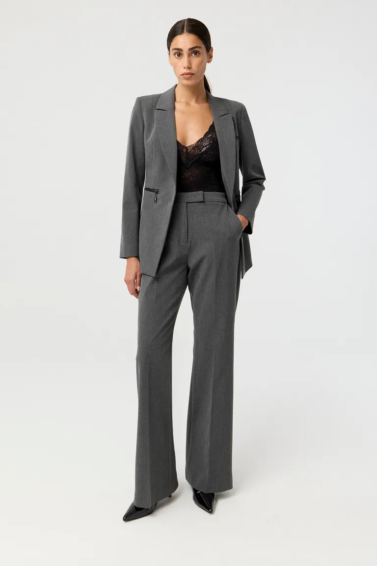 Pantalón de sastrería con diseño de tiro alto y silueta flare, ideal para completar equipos de oficina o eventos. Presenta detalles de cintura cruzada y bolsillos diagonales, ofreciendo una caída favorecedora y un estilo versátil para diversas ocasiones.