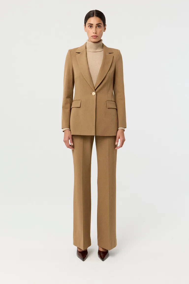 Pantalón de sastrería con diseño de tiro alto y silueta flare, ideal para completar outfits formales y sofisticados. Presenta bolsillos laterales y cierre con botón central, ofreciendo un calce estructurado y elegante para el día a día o eventos especiales.